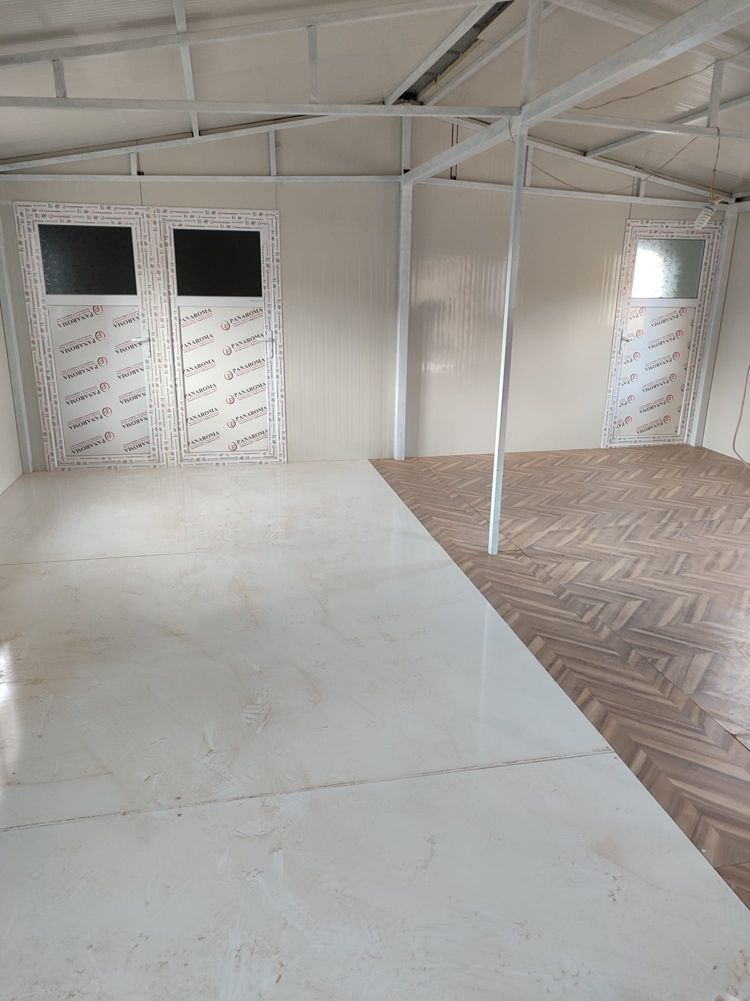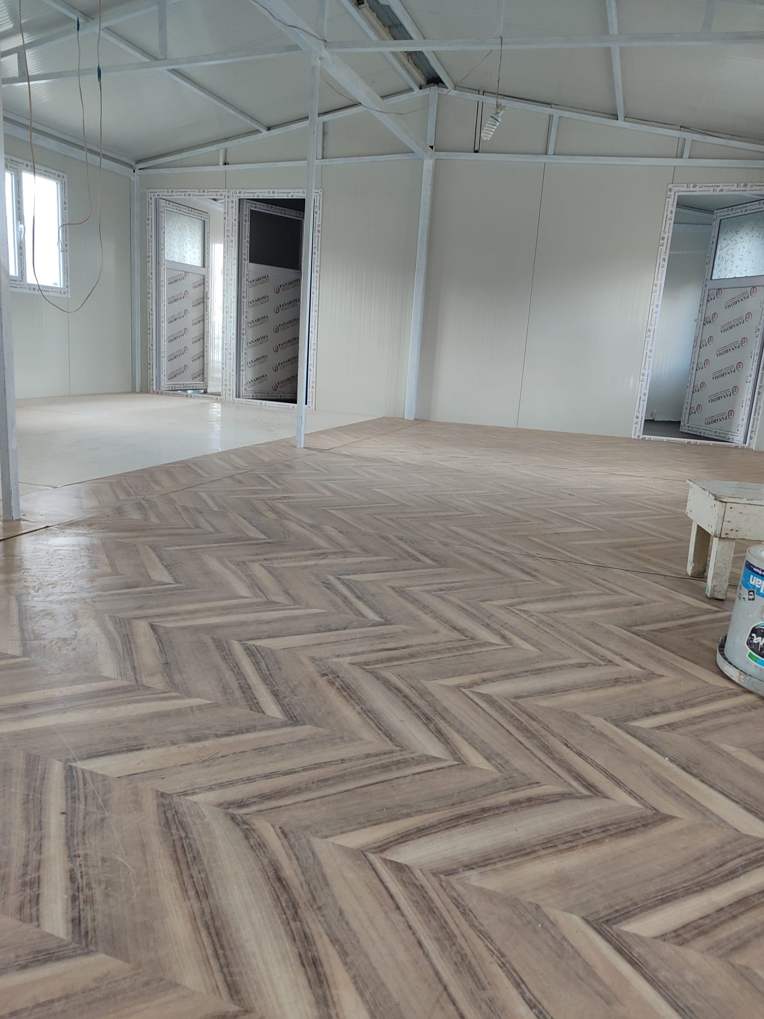 Müşteri talebi üzerine, 75 metrekarelik prefabrik evimizde zemin 18mm kalınlığında cilalı MDF ile kaplanmış, tavanda ise İzocam izolasyon ve lambiri döşemesi bulunmaktadır .